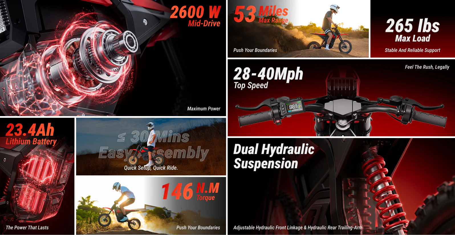 The2600Wmid-drive motor drives you smoothly up to40 MPH, delivering precise control and rock-solid stability through every turn and jump. Twist the throttle and experience true dirt bike performance—pure adrenaline, total confidence.